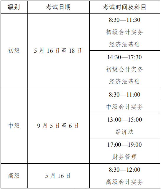 初级资格考试于2026年5月16日至18日举行,共6个批次。《初级会计实务》科目考试时长为105分钟,《经济法基础》科目考试时长为75分钟,两个科目连续考试,时间不能混用;中级资格考试于9月5日至6日举行,共2个批次。《中级会计实务》科目考试时长为150分钟、《经济法》科目考试时长为120分钟、《财务管理》科目考试时长为120分钟;高级资格考试于5月16日举行,共1个批次。《高级会计实务》科目考试时长为210分钟。